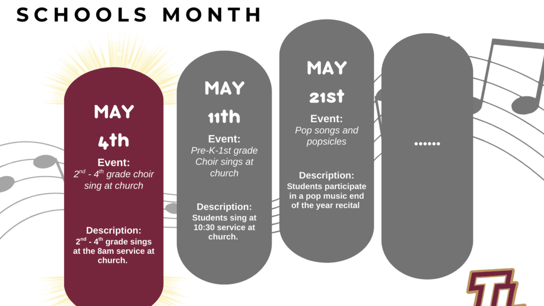 Please refer to our running flyer of all of our musical events. This includes choir, guitarist, band and orchestra. Our wonderful music teachers are: Mrs. Rescot-Orchestra and Junior Choir Mrs. Good- Primary Choir Mrs. Fliege- Middle School Choir Mr. Barteau-...