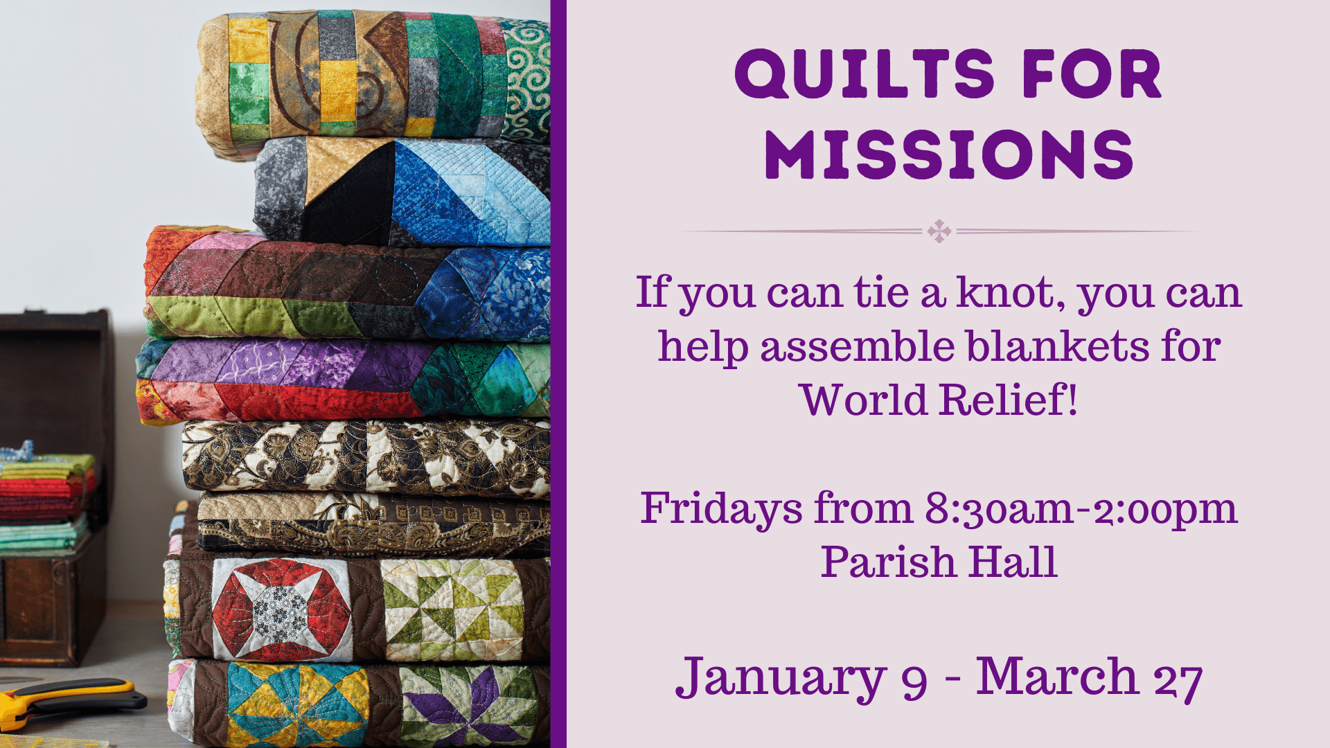 Looking for a way to serve in the new year? Help those in need by assembling tied quilts for missions in the Parish Hall on Fridays January 9 through March 27 from 8:30am to 2:00pm. Come for as long as you can! Bring a sack lunch if you plan to stay all day. Please join us in this project that will benefit people around the world.